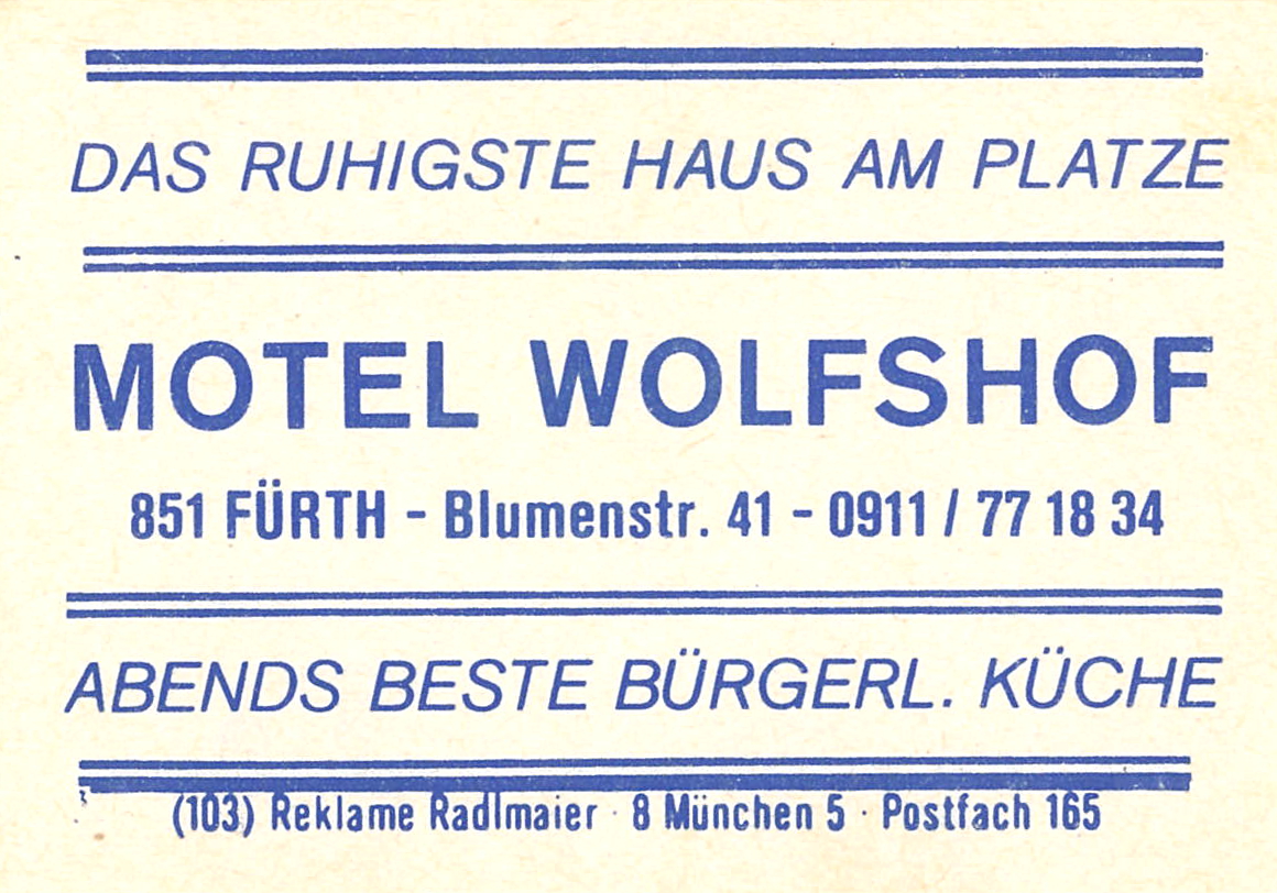 | Dateiinfo (Bild-Unterschrift und Info-Box, automatisch erstellt) | Zündholzschachtel-Etikett der ehemaligen Motel Wolfshof, um 1965 Lizenz: CC BY-SA 3.0 | ||