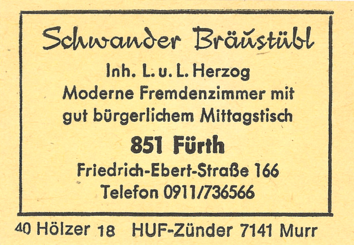 | Beschreibung | Zündholzschachtel-Etikett der ehemaligen Gaststätte Schwander Bräustübl, um 1965 | ||