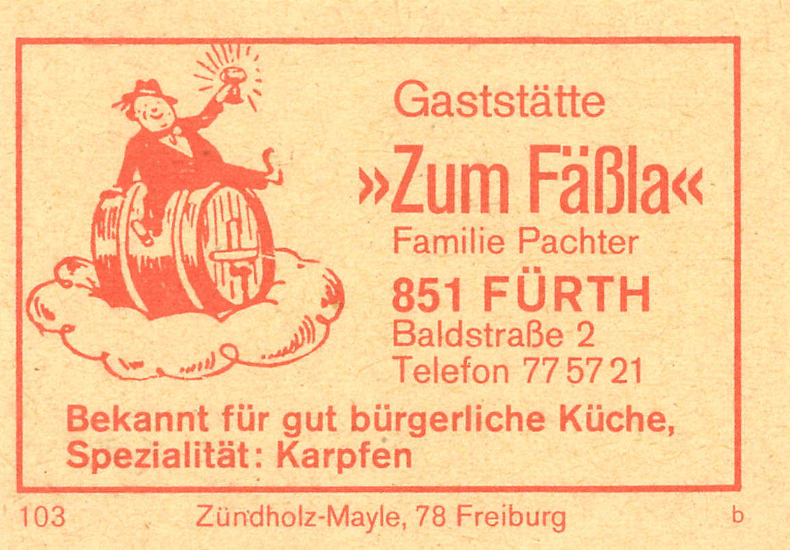 | Beschreibung | Zündholzschachtel-Etikett der ehemaligen Gaststätte Zum Fäßla, um 1965 | ||