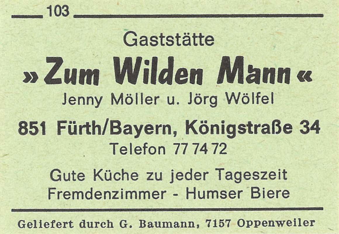 | Beschreibung | Zündholzschachtel-Etikett der Gaststätte Zum Wilden Mann, um 1965 | ||