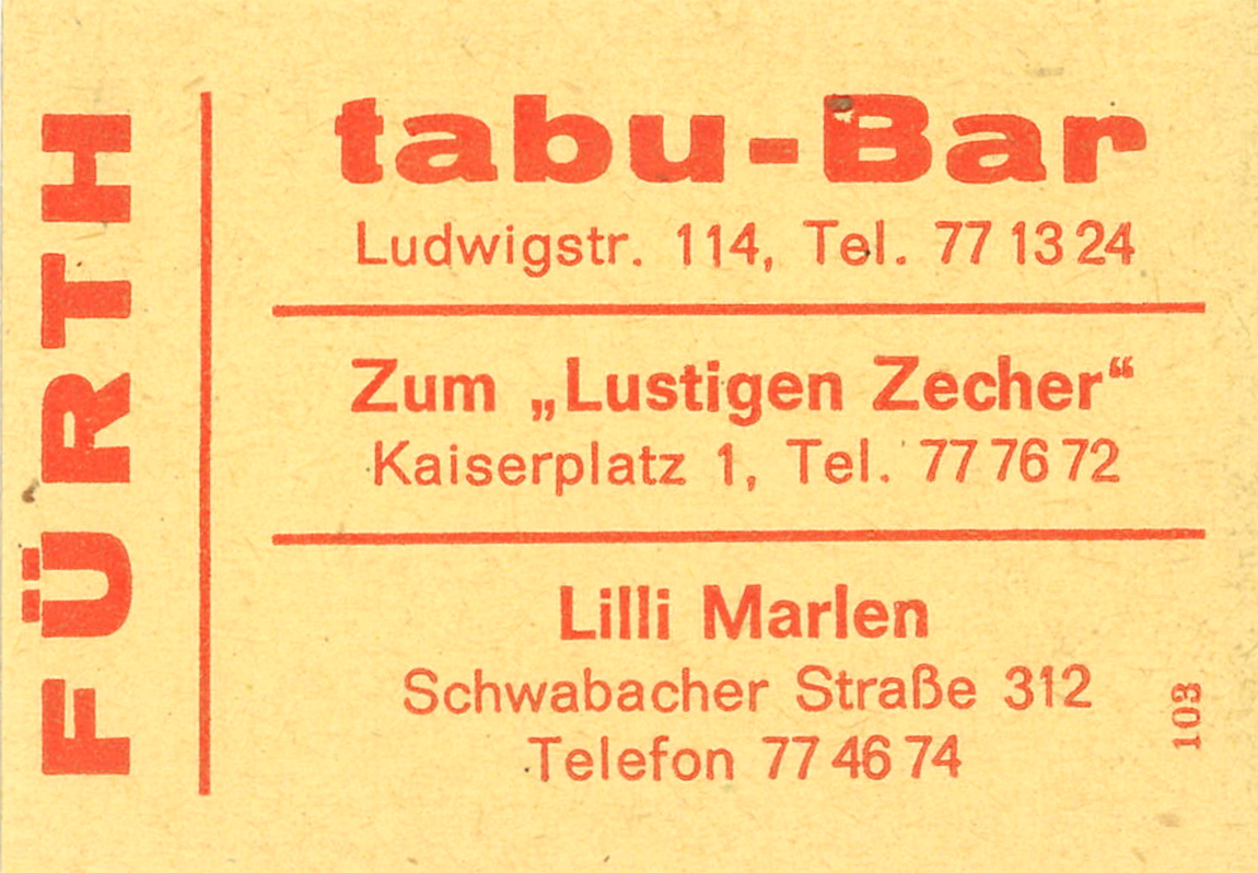 | Beschreibung | Zündholzschachtel-Etikett der tabu-Bar, und der ehemaligen Gaststätten Zum lustigen Zecher und Lilli Marleen, um 1965 | ||