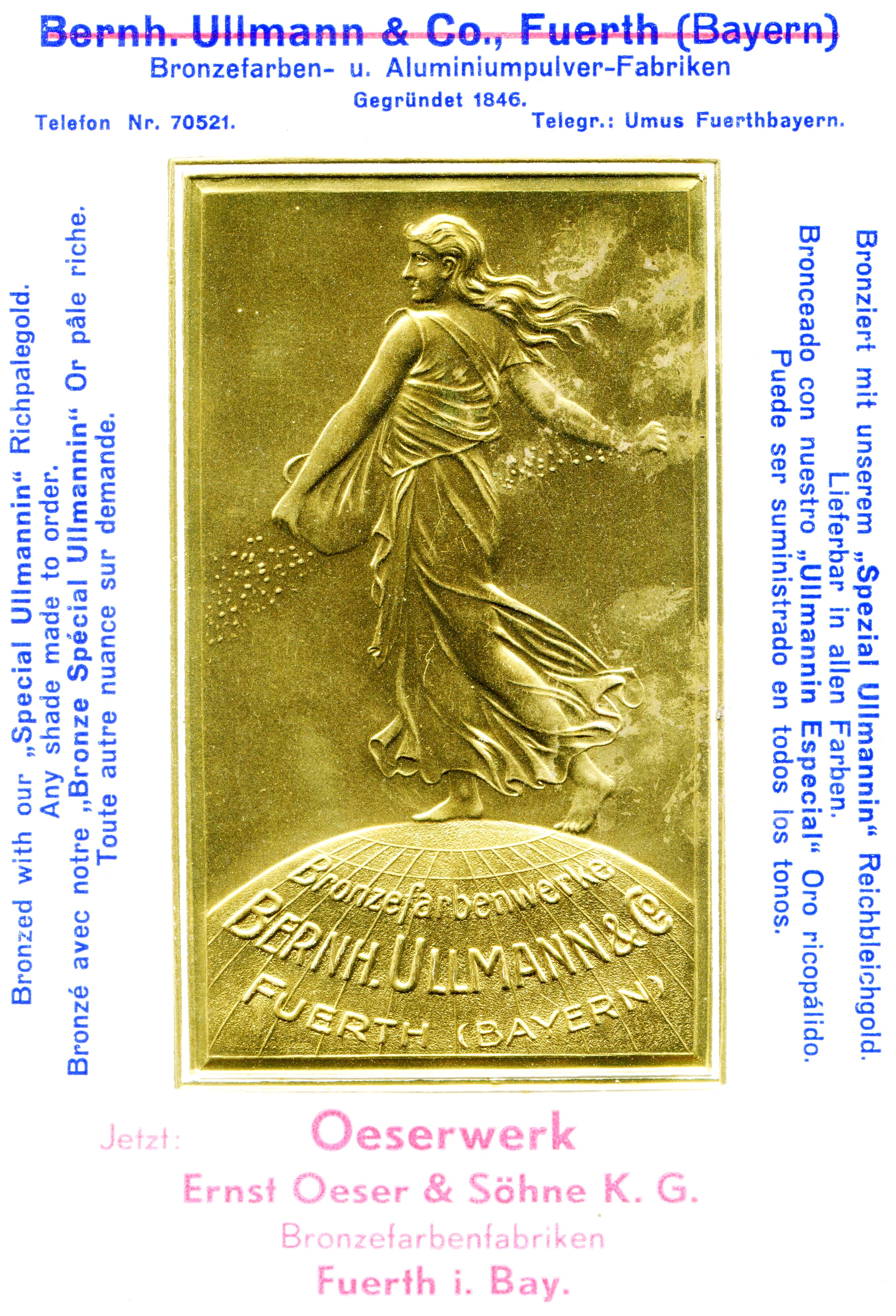 | Beschreibung | Werbekarte für die Bronzefabriken ehem. Bernh. Ullmann & Co., jetzt Oeserwerk - Ernst Oeser & Söhne K. G. | ||
