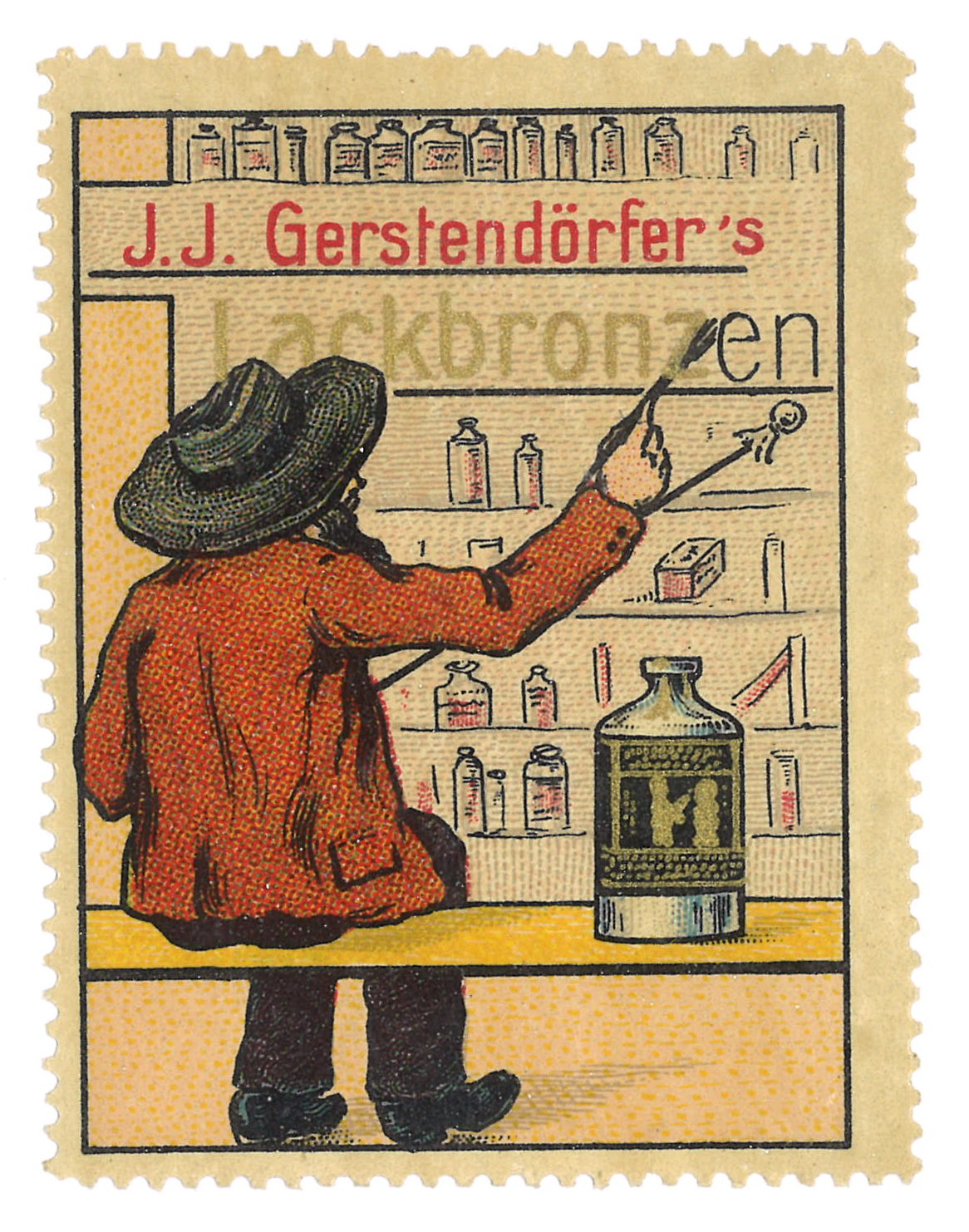 | Beschreibung | Historische Reklamemarke des Bronzefarbenherstellers J. J. Gerstendörfer | ||