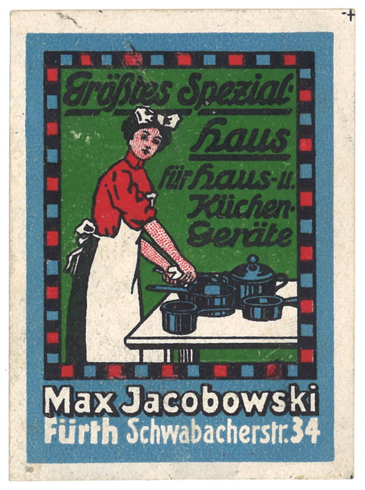 | Dateiinfo (Bild-Unterschrift und Info-Box, automatisch erstellt) | Historische Reklamemarke, Küchen-Bazar Max Jacobowski, um 1910 Lizenz: CC BY-SA 3.0 | ||