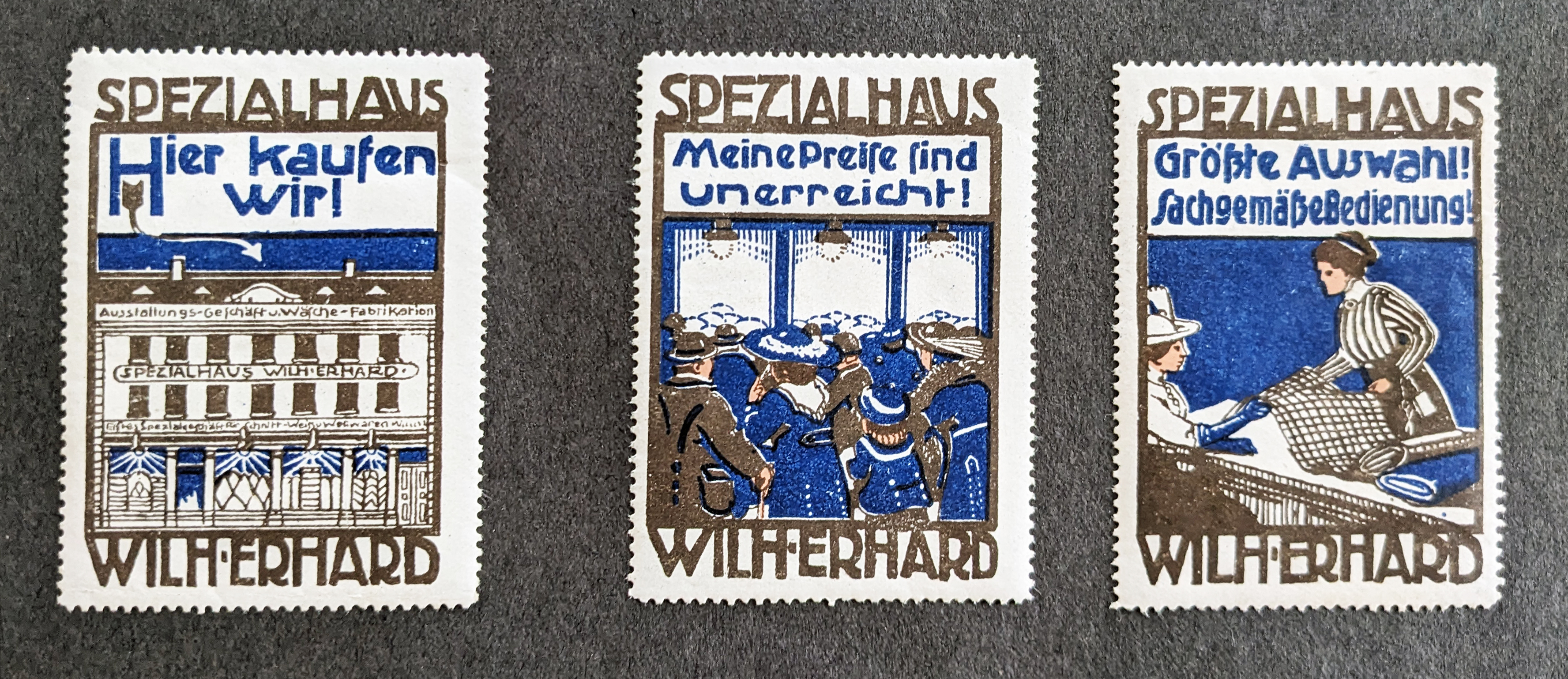 | Beschreibung | Historische Reklamemarke des Spezialhauses Wilhelm Erhard, Sternstraße 5, ca. 1913 | ||