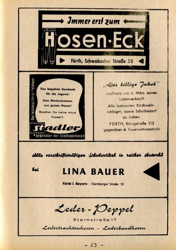 | Beschreibung | Werbeseite aus der Schülerzeitung Die Pennalen Nr. 4 1961 von div. Fürther Geschäften | ||