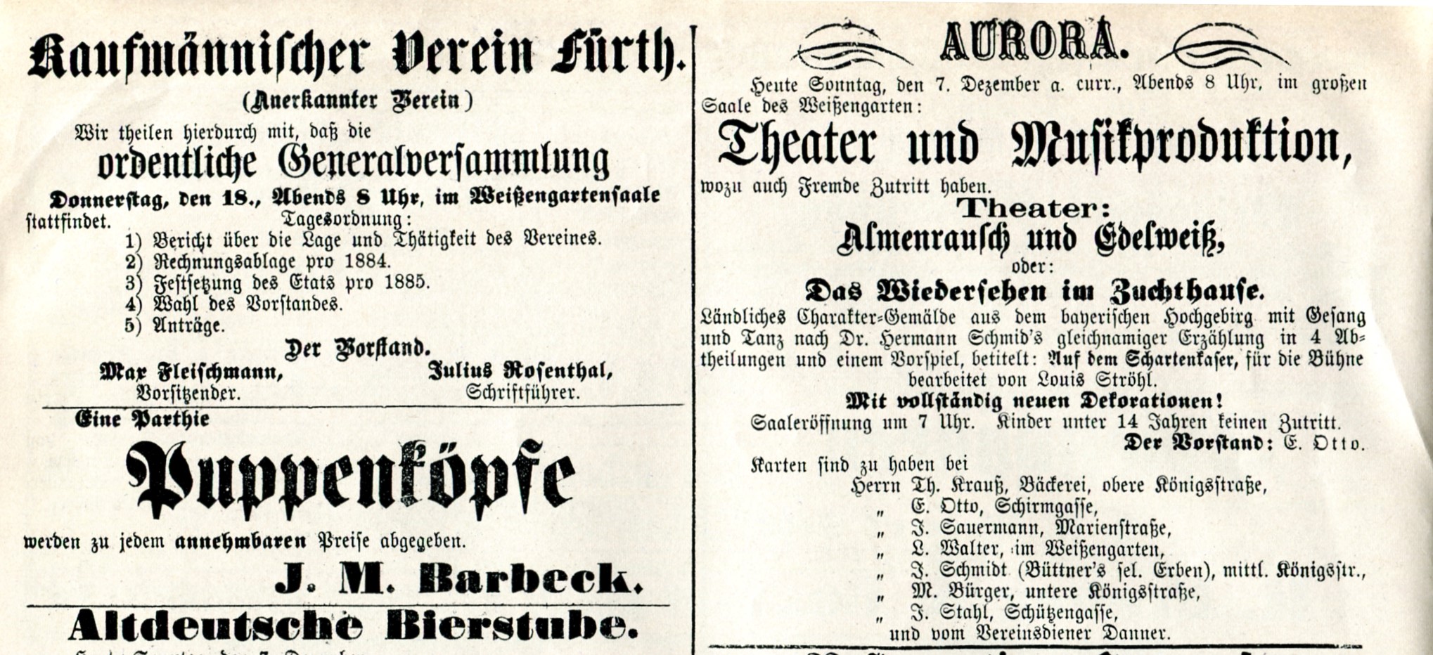 Werbung im Fürther Tagblatt vom 7.12.1884 im Weißengarten. Komplette Zeitung unter Fürther Tagblatt vorhanden und nachlesbar.