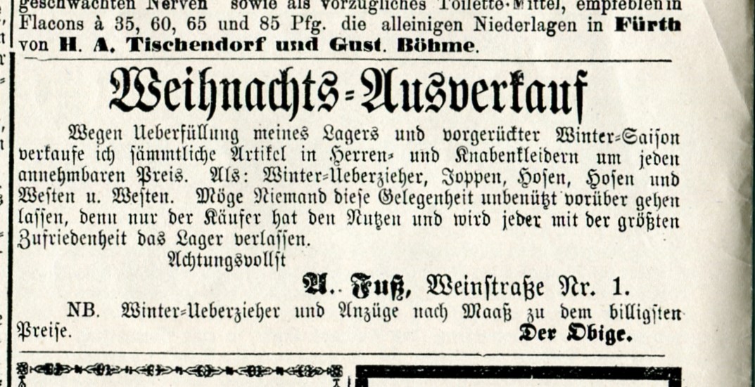 | Beschreibung | Werbung im Fürther Tagblatt vom 7.12.1884. Komplette Zeitung unter Fürther Tagblatt vorhanden und nachlesbar. | ||