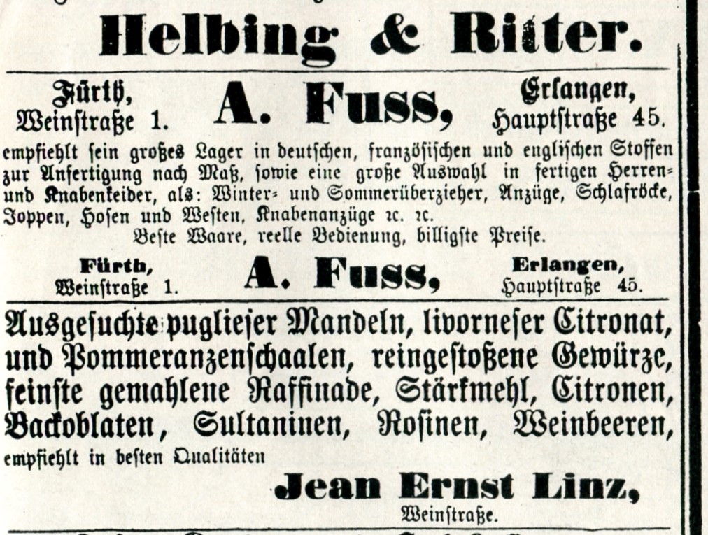 | Dateiinfo (Bild-Unterschrift und Info-Box, automatisch erstellt) | Werbung im Fürther Tagblatt vom 7.12.1884. Komplette Zeitung unter Fürther Tagblatt vorhanden und ... Werbung im Fürther Tagblatt vom 7.12.1884. Komplette Zeitung unter Fürther Tagblatt vorhanden und nachlesbar.<br>Urheber: Fürther Tagblatt<br><br>Lizenz: CC BY-SA 3.0 | ||