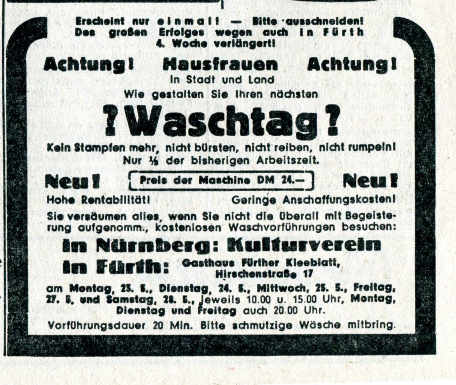 | Beschreibung | Werbung in der FN vom 11.08.1948 für eine Verkaufsveranstaltung im Fürther Kleeblatt | ||