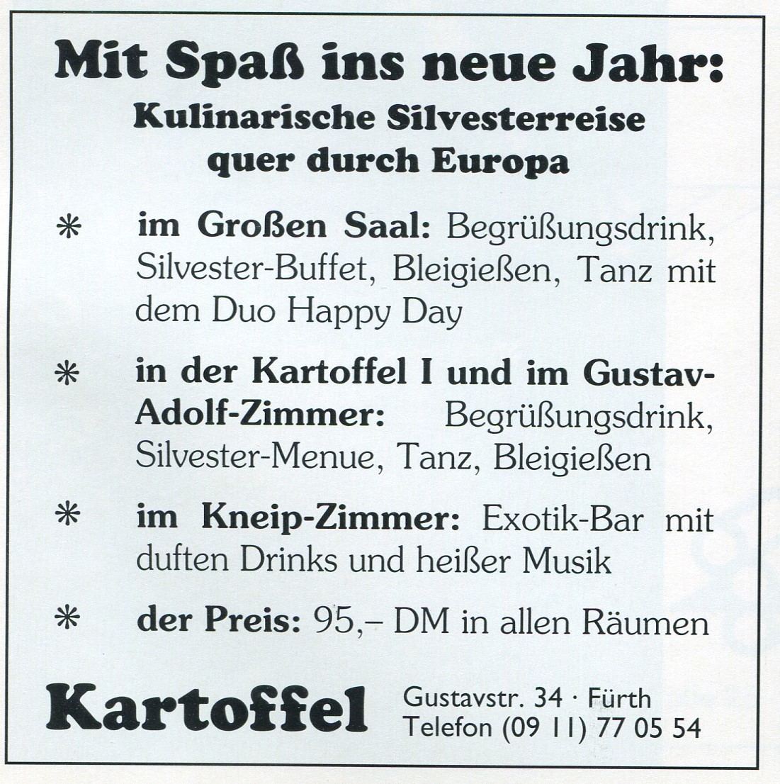 | Beschreibung | Werbung 1995 Restaurant "Kartoffel" von Heidi Sänger heute wieder Grüner Baum | ||