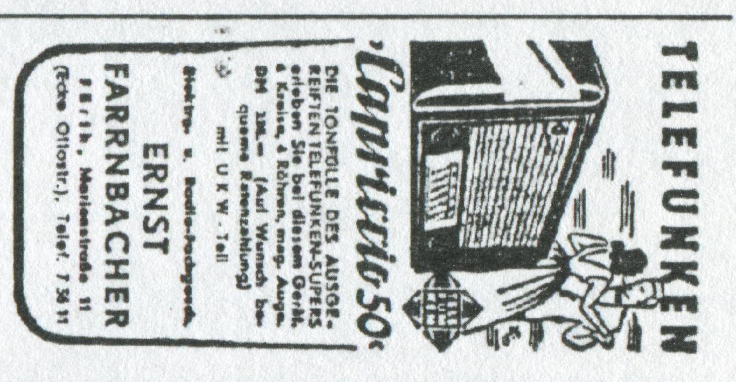 Werbung 1950 vom Radiofachgeschäft Ernst Farrnbacher in der Marienstraße 11, das hier einige Jahre nach dem Krieg bestand