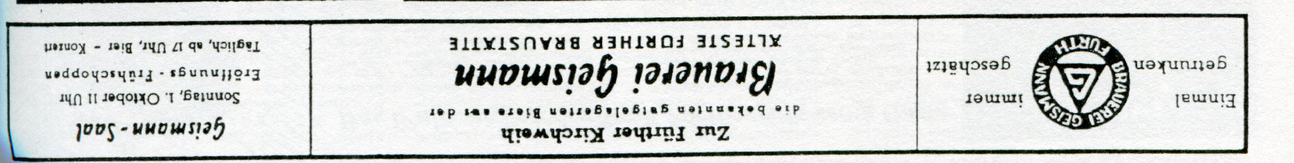 | Beschreibung | Werbung zur Fürther Kirchweih 1950 der Brauerei Geismann und dem Geismannsaal | ||