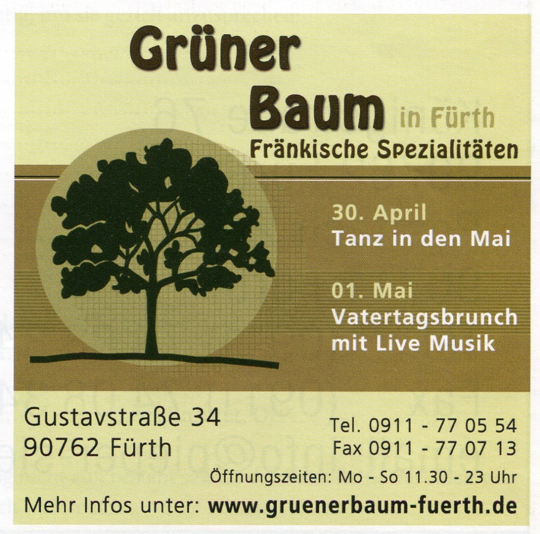 | Dateiinfo (Bild-Unterschrift und Info-Box, automatisch erstellt) | Werbung vom Gasthaus Grüner Baum 2008 in der Gustavstraße 34 Urheber: Grüner Baum<br><br>Lizenz: CC BY-SA 3.0 | ||