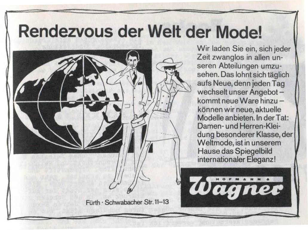 | Dateiinfo (Bild-Unterschrift und Info-Box, automatisch erstellt) | Werbung vom Bekleidungshaus Hofmann und Wagner in der Schülerzeitung Die Pennalen Nr. 3 1969 Urheber: Hofmann und Wagner<br><br>Lizenz: CC BY-SA 3.0 | ||