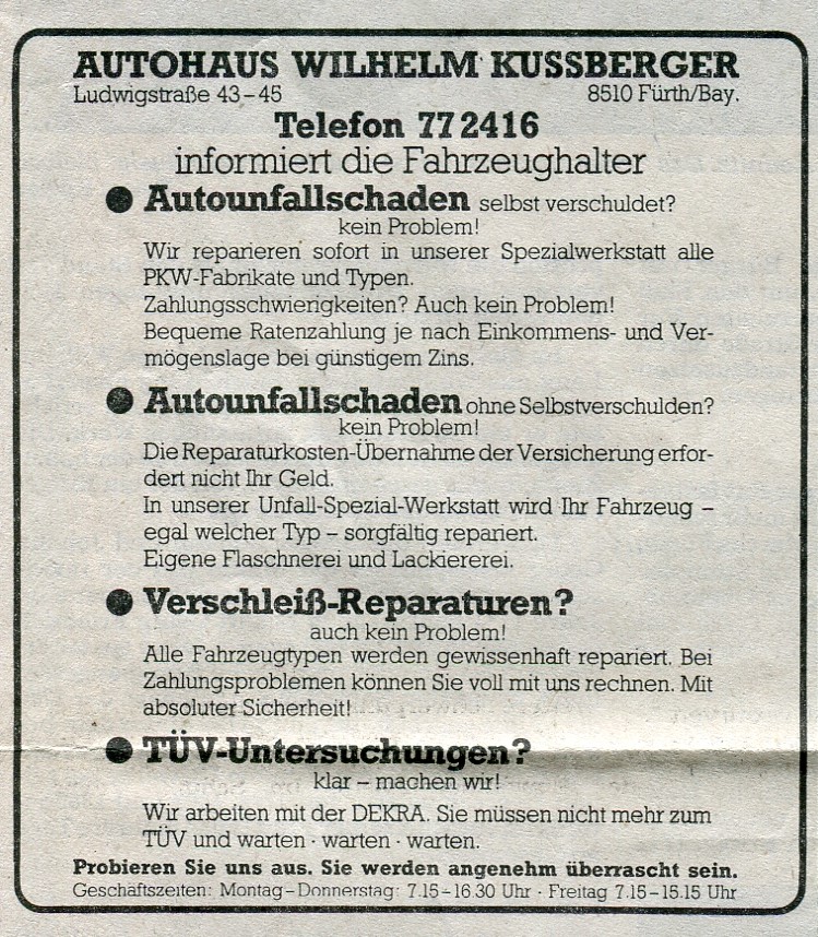 | Beschreibung | Werbung in der FN vom Autohaus Wilhelm Kussberger 1983 | ||