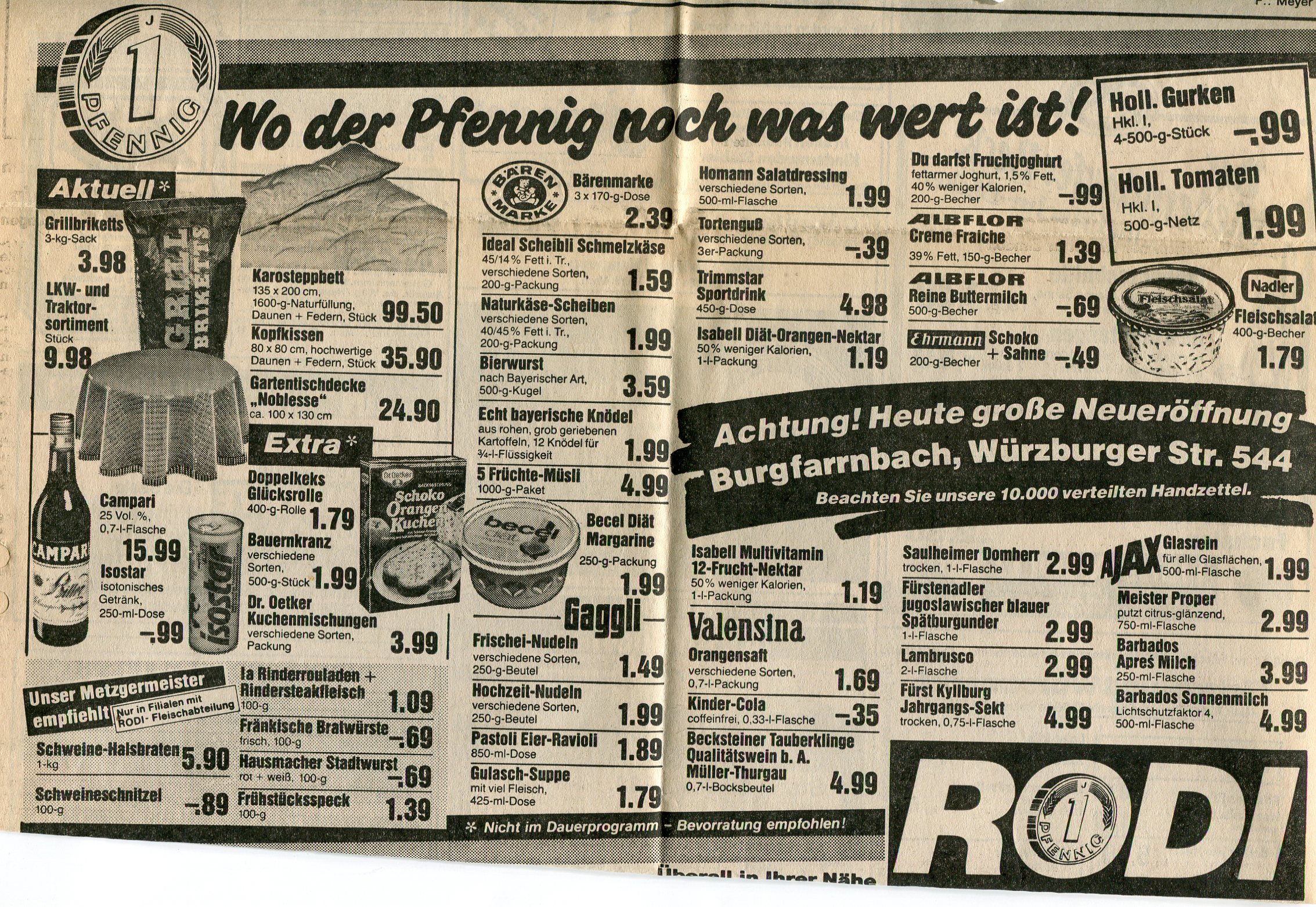 | Dateiinfo (Bild-Unterschrift und Info-Box, automatisch erstellt) | Werbung in der FN wegen Neueröffnung Rodi in Burgfarrnbach 1989 Urheber: RODI<br><br>Lizenz: CC BY-SA 3.0 | ||