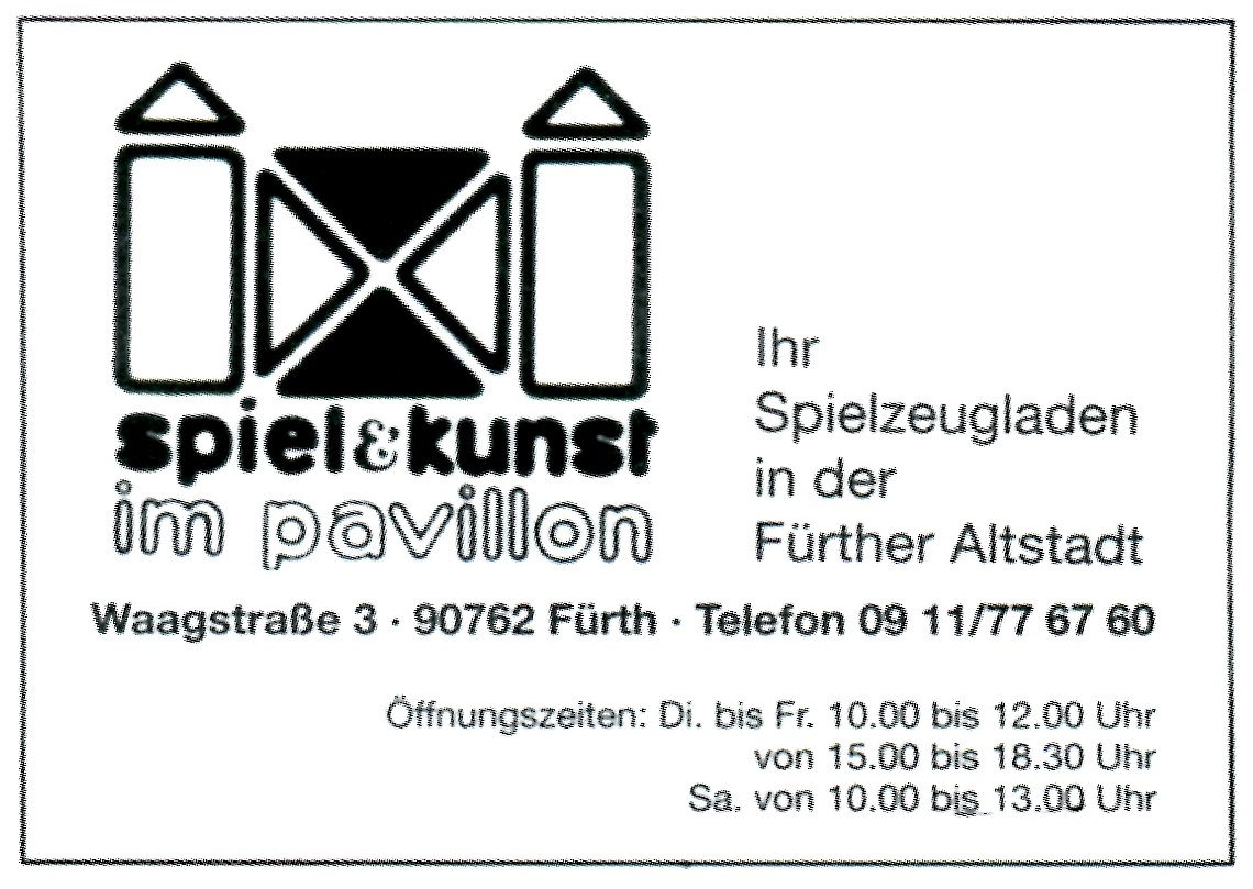 BeschreibungWerbung des ehemaligen Spielzeugladen "Spiel + Kunst" in der Waagstraße 3 1995