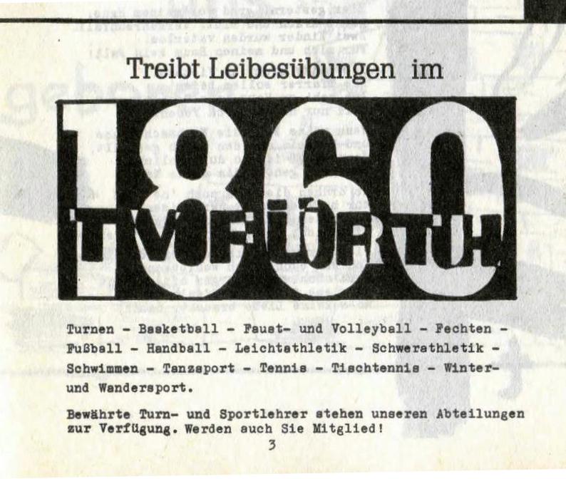 | Beschreibung | Werbung vom Sportverein TV Fürth 1860 in der Schülerzeitung Die Pennalen Nr. 2 1966 | ||