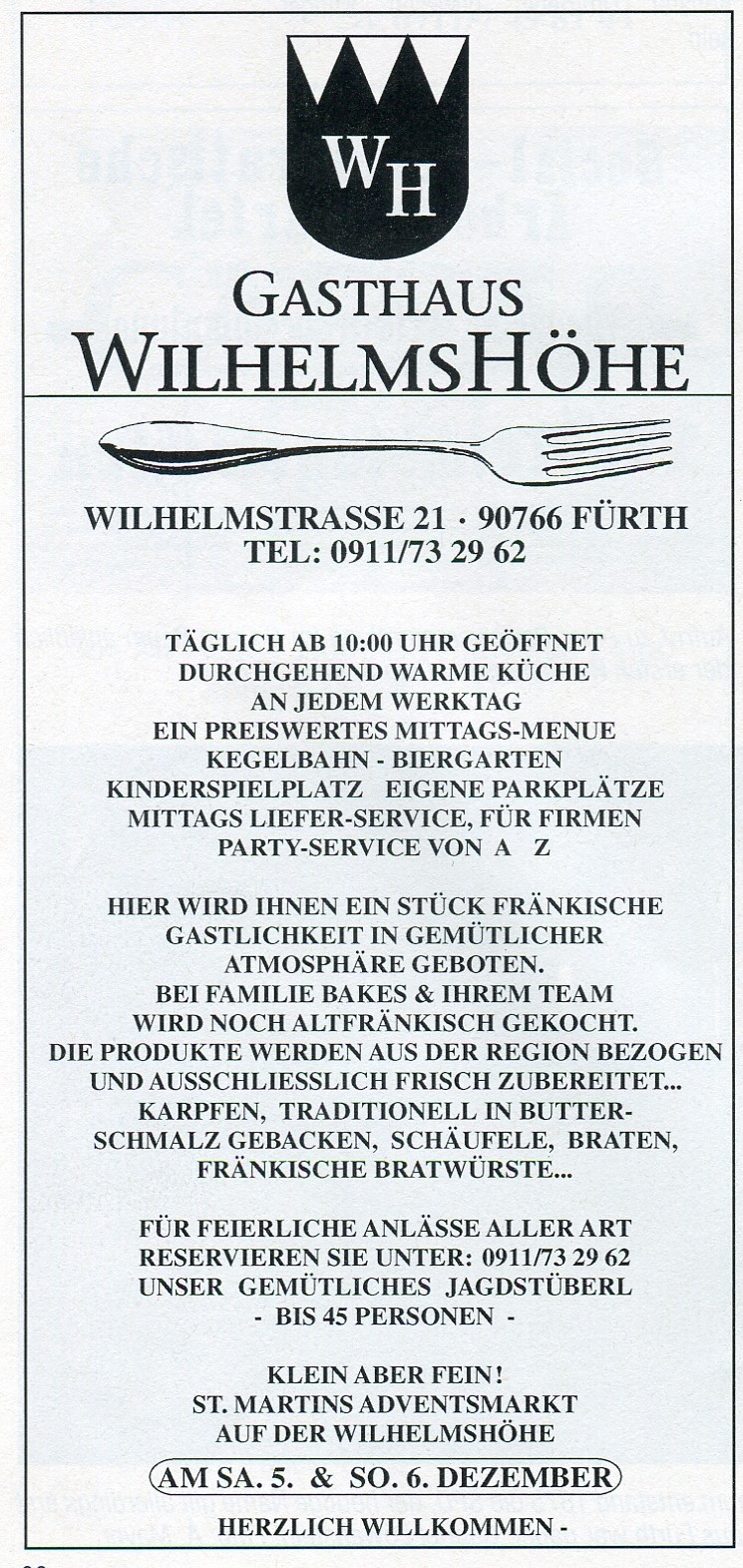 Werbung Wilhelmshöhe (Gaststätte) Dez. 1998 im "Altstadtbläddla" Nr. 33
