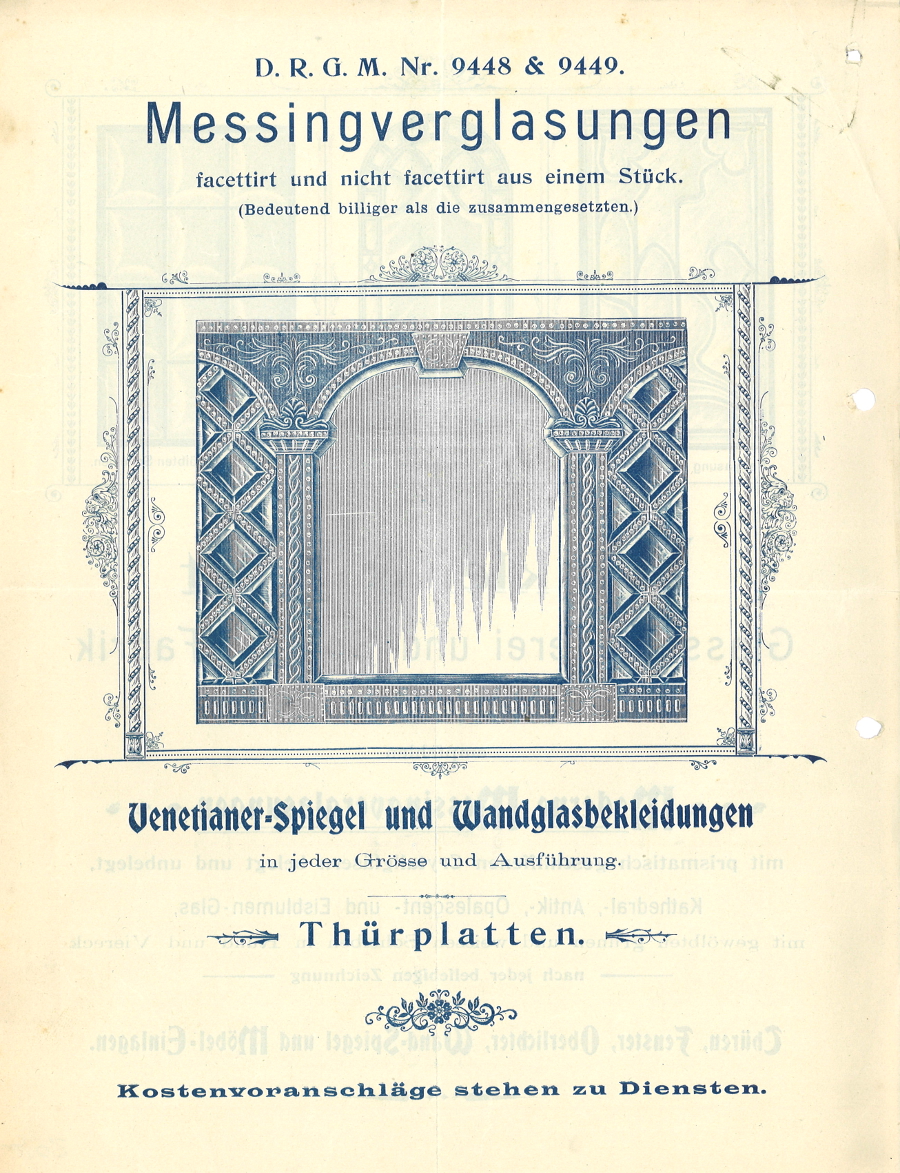 | Beschreibung | Historisches Werbeblatt der Spiegelfabrik Winkler & Kütt von 1900 (Rückseite) | ||
