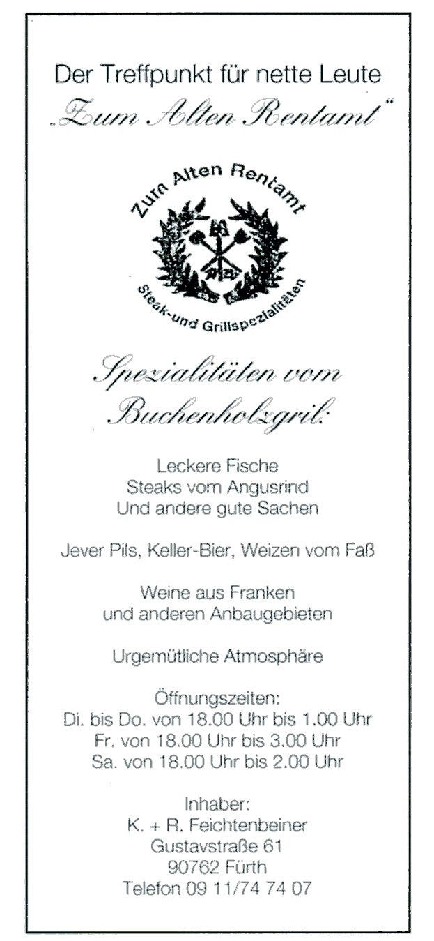 | Beschreibung | Werbung Gaststätte Zum Alten Rentamt Dez. 1998 im "Altstadtbläddla" Nr. 33 | ||