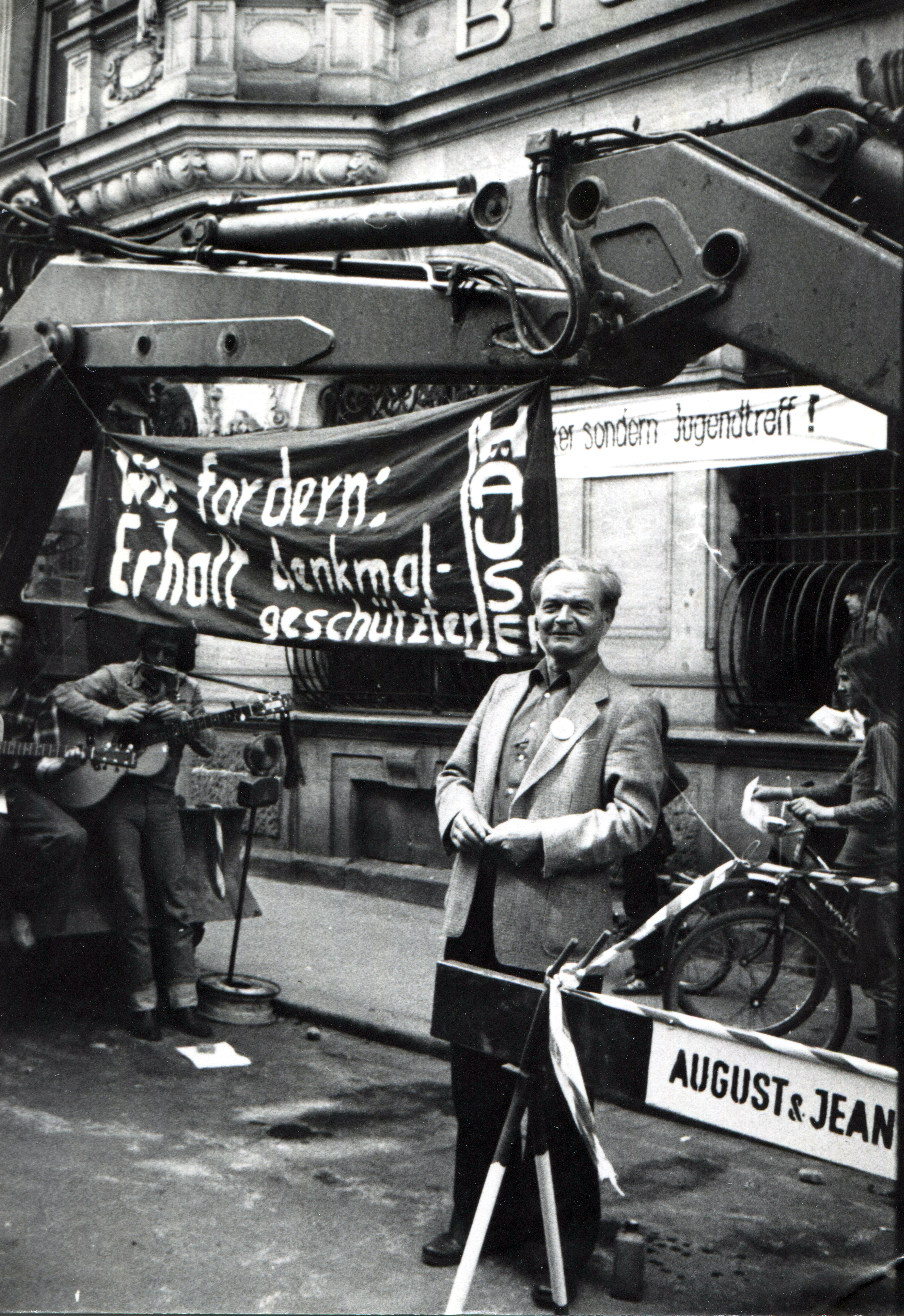 | Beschreibung | DKP-Stadtrat Werner Riedel bei der symbolischen Hausbesetzung des Geismann-Bräustübls am 11. April 1981 in der Bäumenstraße. Auf den Transparenten am Bagger und der Brauerei-Fassade im Hintergrund: "Wir fordern: Erhalt denkmalgeschützter Häuser" und "Kein Konsumbunker sondern Jugendtreff". | ||