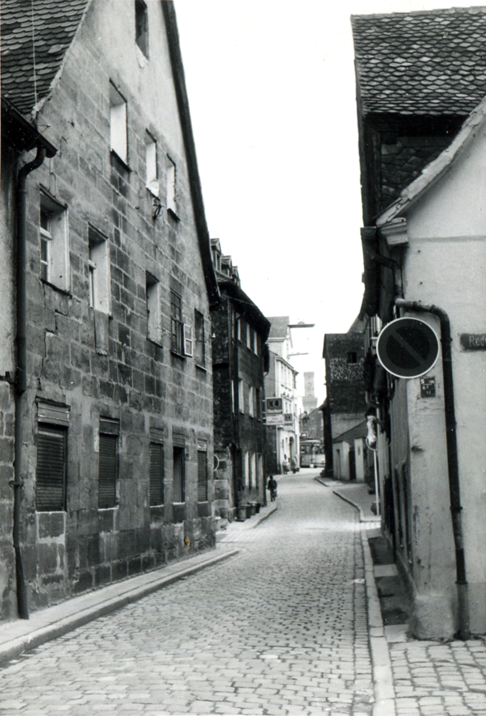 | Beschreibung | Die Wilhelm-Löhe-Straße, links die Gaststätte "Zum kalten Loch" - im Hintergrund der Rathausturm, 1973 | ||