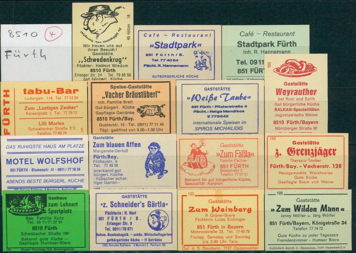 | Beschreibung | Werbeanzeigen Fürther Gasthäuser auf Zündholzschachteln aus den 1960er - 1970er Jahren. | ||