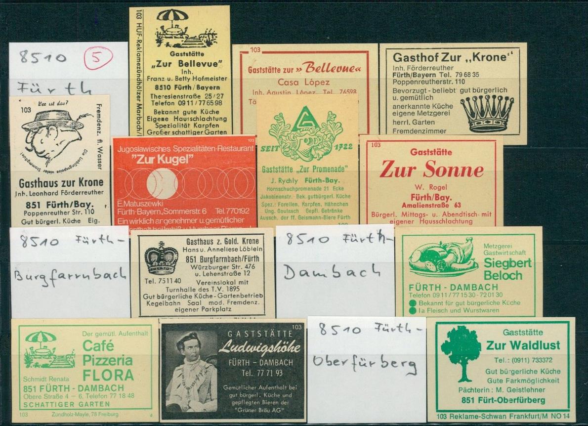 | Beschreibung | Werbeanzeigen Fürther Gasthäuser auf Zündholzschachteln aus den 1960er - 1970er Jahren. | ||