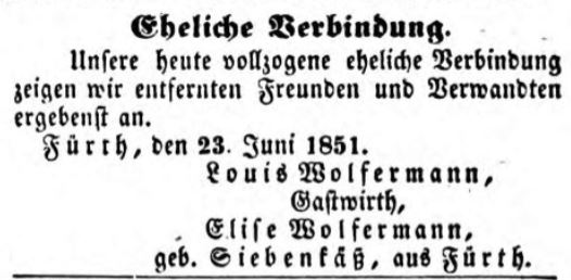 | Beschreibung | Zeitungsinserat des Gastwirts Louis Wolfermann anlässlich seiner Vermählung mit Elise Siebenkäß, Juni 1851 | ||