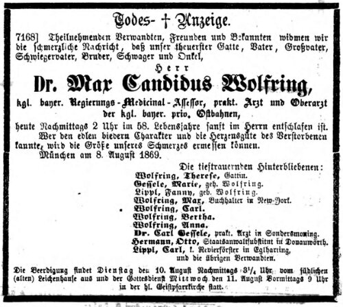 | Beschreibung | Todesanzeige von Max Wolfring, August1869 | ||