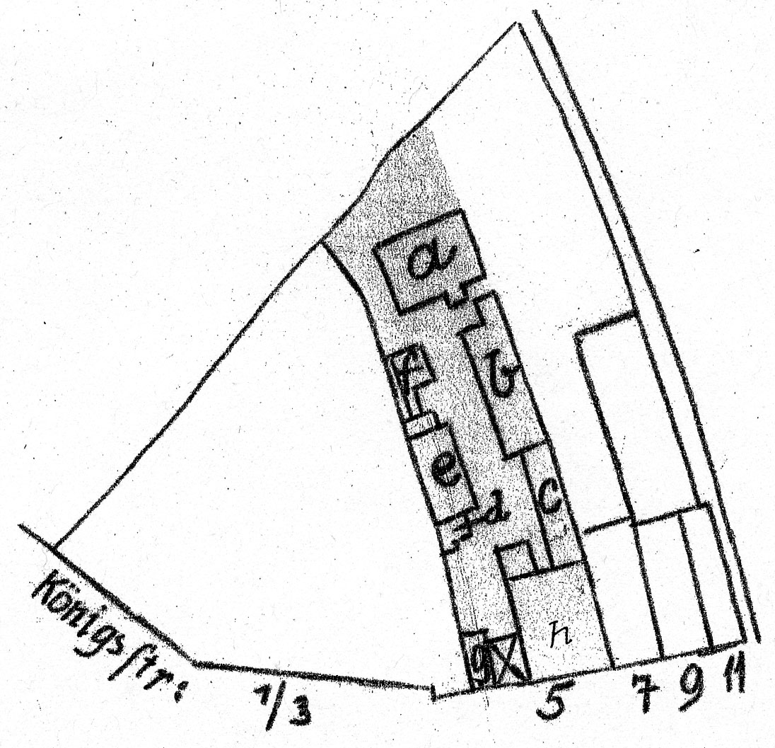 | Dateiinfo (Bild-Unterschrift und Info-Box, automatisch erstellt) | Lageplan der Gebäude auf dem Grundstück Königstraße 5 nach Gottfried Wunschel Urheber: Gottfried Wunschel<br><br>Lizenz: CC BY-SA 3.0 | ||
