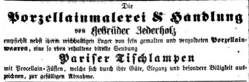| Beschreibung | Zeitungsannonce Gebr. Zederholz, Dezember 1857 | ||