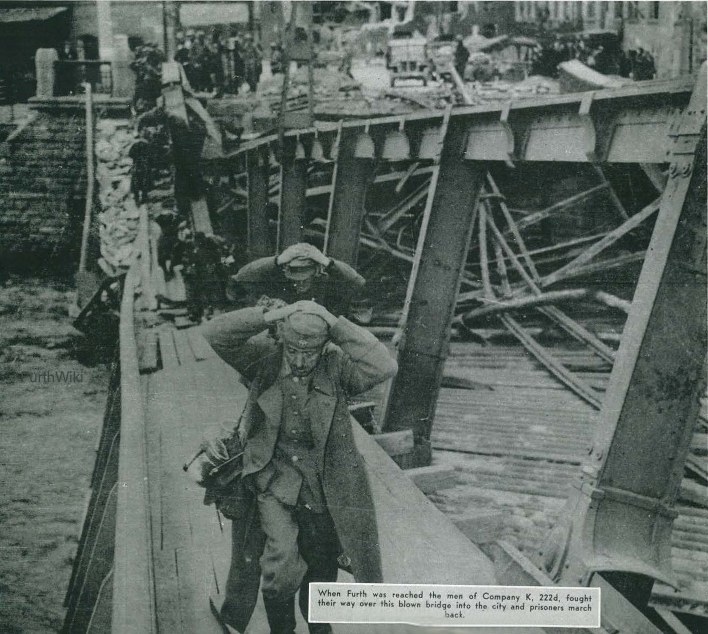 | Dateiinfo (Bild-Unterschrift und Info-Box, automatisch erstellt) | Vorrücken der US Kompanie K 222 d zum Rathaus über die zerstörte Maxbrücke am 19. April 1945. Im ... Vorrücken der US Kompanie K 222 d zum Rathaus über die zerstörte Maxbrücke am 19. April 1945. Im Bild gefangene Deutsche Soldaten auf dem Weg in die Stadt zurück.<br>Urheber: Sgt. William R. Hazard & Cpl. Clifford Lohs<br><br>Lizenz: CC BY-SA 3.0 | ||