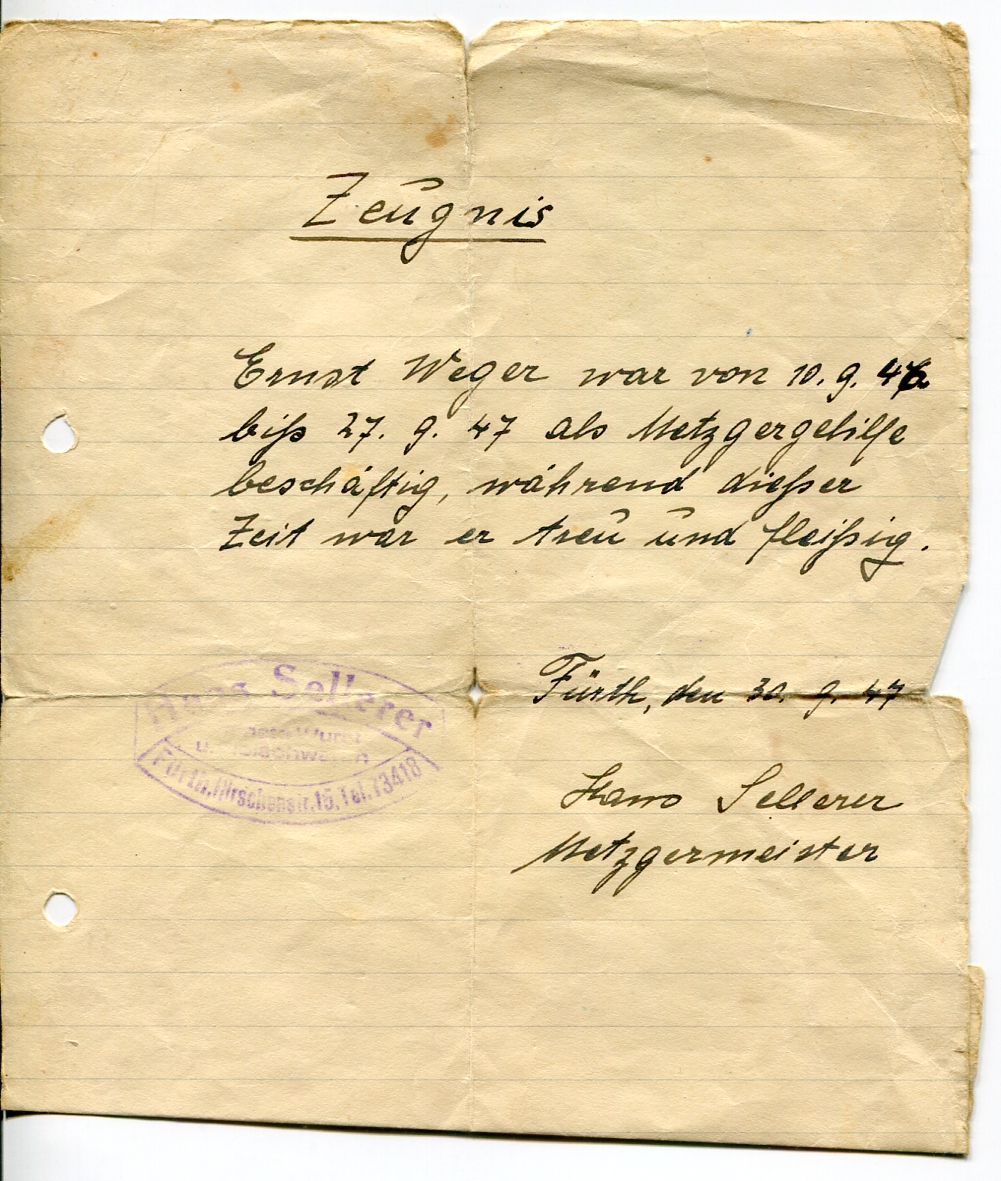 Zeugnis handgeschrieben der Metzgerei Hans Sellerer in der Hirschenstraße 15 von 1947