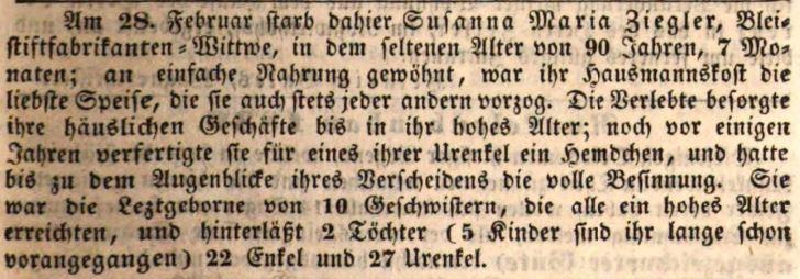 | Beschreibung | Zeitungsartikel über das Ableben der Susanna Maria Ziegler, März 1839 | ||