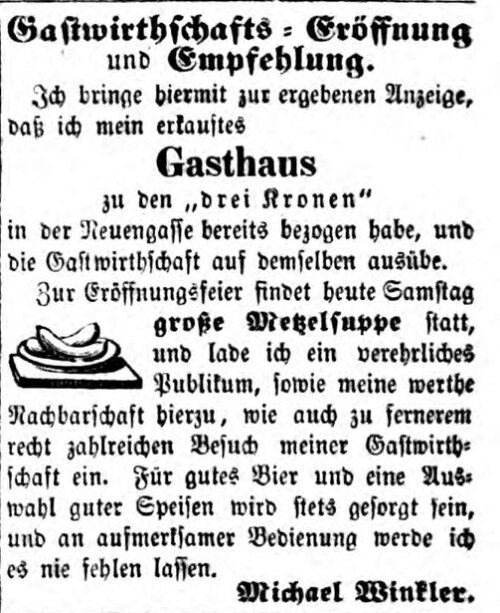 | Beschreibung | Wirtschafts-Eröffnung zu den "drei Kronen" in der "Neuengasse", August 1857 | ||
