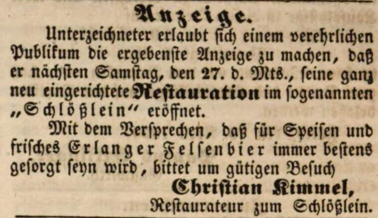 | Beschreibung | Eröffnung der Restauration zum Schlößlein, April 1850 | ||