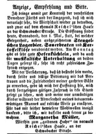 | Beschreibung | Zeitungsanzeige der Wirtin Margaretha Müller anlässlich der Eröffnung ihrer Wirtschaft zum goldenen Hahn, Mai 1852 | ||