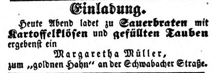 | Beschreibung | Zeitungsannonce der Wirtin zum "goldnen Hahn", August 1852 | ||