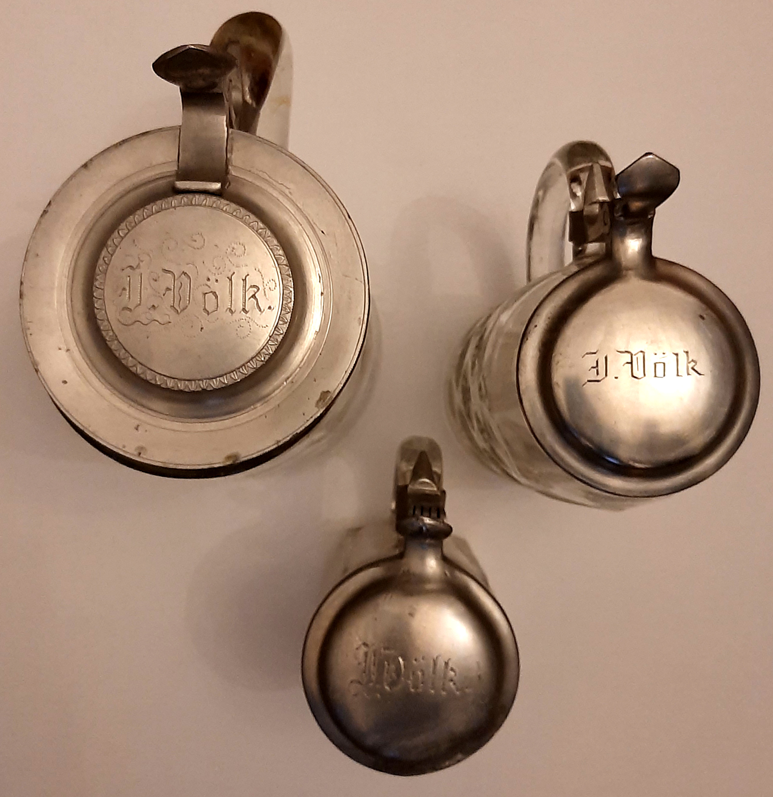 | Beschreibung | verschiedene Wirtshausgläser der ehemaligen Gaststätte Zum grünen Baum in Vach. V. l. n. r.: 2l-Krug, 1l-Krug, davor 0,5l-Krug | ||