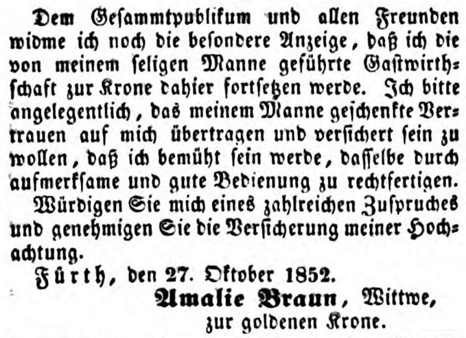 | Dateiinfo (Bild-Unterschrift und Info-Box, automatisch erstellt) | Zeitungsanzeige der Wirtin A. Braun zur goldenen Krone, Oktober 1852 Lizenz: NoC-NC 1.0 | ||