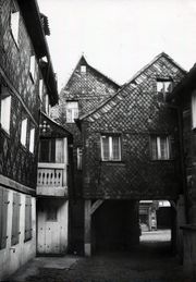 Lizenz: CC BY-SA 3.0Die ehem. Geleitsgasse, in der Bildmitte Nr. 2 (Giebel), rechts daneben die Rückgebäude von ... Die ehem. Geleitsgasse, in der Bildmitte Nr. 2 (Giebel), rechts daneben die Rückgebäude von Staudengasse 16 u. 18. Links angeschnitten Geleitsgasse Nr. 1 (verschiefert), 1969. Nach Abriss des Geleitshauses freier Durchblick zur Königstraße, im Hintergrund ist Königstr. 37 zu erkennen
