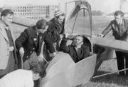 Lizenz: Bildlizenz-StadtarchivKäthe Brand mit Hans Wolkenstein (Nordbayerischer Flugdienst, links) und Hans Böllner (Landpolizei). Lizenz: CC BY-SA 3.0