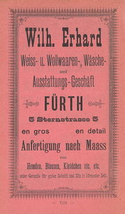Lizenz: CC BY-SA 3.0Anzeige Wilhelm Erhard Textilien, Nürnberg-Fürther Israelitisches Gemeindeblatt 1. Mai 1927 Urheber: Nürnberg-Fürther Israelitisches Gemeindeblatt
