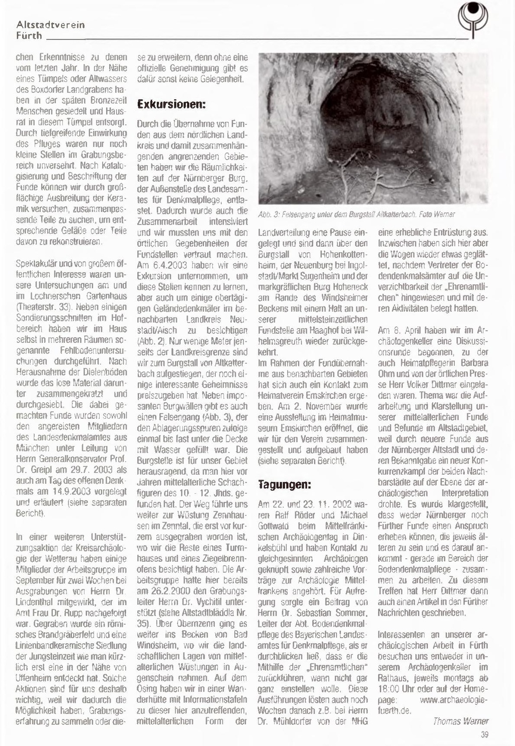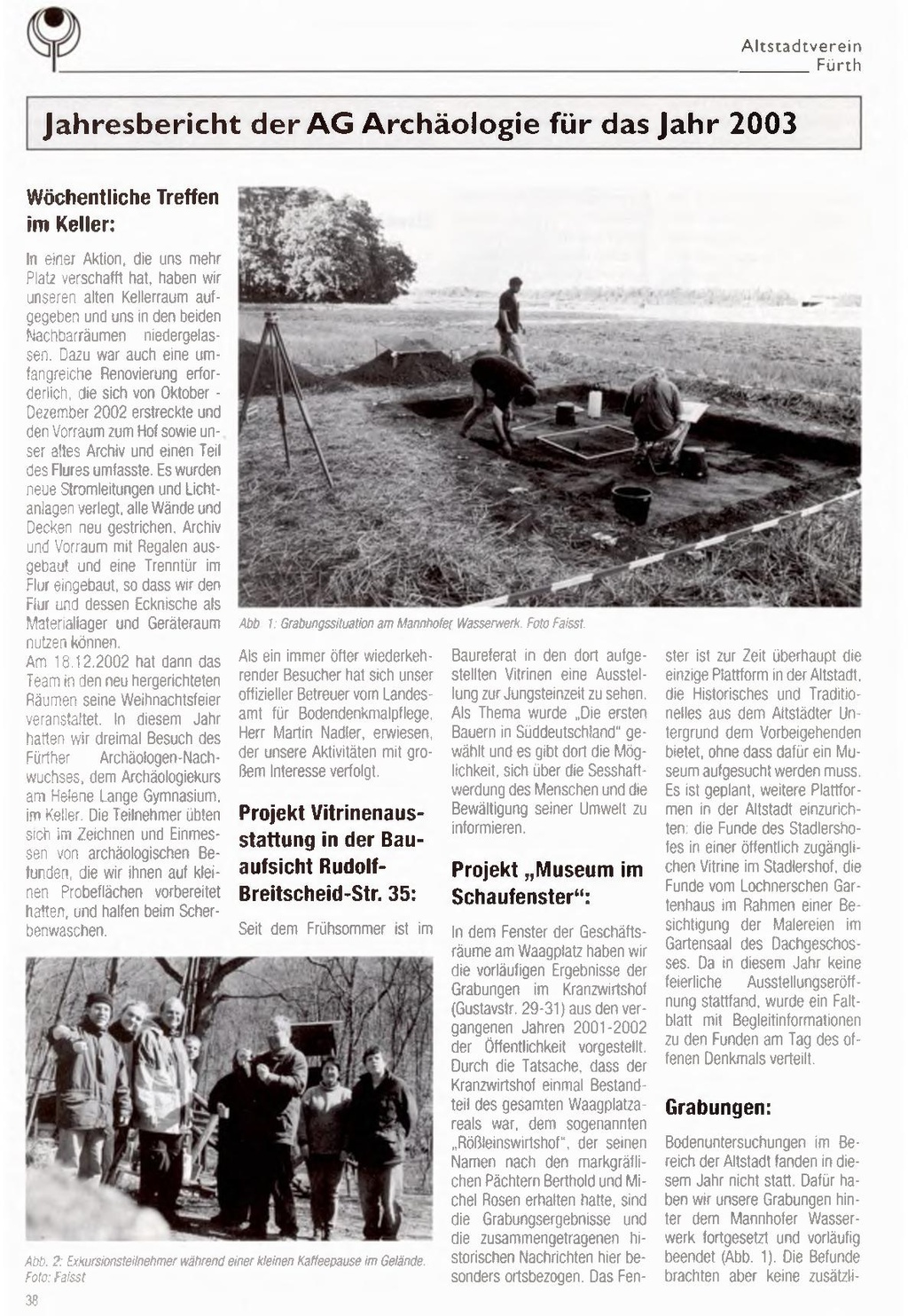 Jahresbericht der AG Archäologie für das Jahr 2003 Wöchentliche Treffen im Keller: In einer Aktion, die uns mehr Platz verschafft hat, haben wir unseren alten Kellerraum auf gegeben und uns in den beiden Nachbarräumen niedergelas sen. Dazu war auch eine um fangreiche Renovierung erfor derlich. die sich von Oktober Dezember 2002 erstreckte und den Vorraum zum Hof sowie un ser altes Archiv und einen Teil des Flures umfasste. Es wurden neue Stromleitungen und Licht anlagen verlegt, alle Wände und Decken neu gestrichen. Archiv und Vorraum mit Regalen aus gebaut und eine Trenntür im Flur eingebaut, so dass wir den Flur und dessen Ecknische als Materiallager und Geräteraum nutzen können. Am 18.12.2002 hat dann das Team in den neu hergerichteten Räumen seine Weihnachtsfeier veranstaltet. In diesem Jahr hatten wir dreimal Besuch des Fürther Archäologen-Nachwuchses, dem Archäologiekurs am Helene Lange Gymnasium, im Keller. Die Teilnehmer übten sich im Zeichnen und Einmes sen von archäologischen Be funden. die wir ihnen auf klei nen Probeflächen vorbereitet hatten, und halfen beim Scher benwaschen.