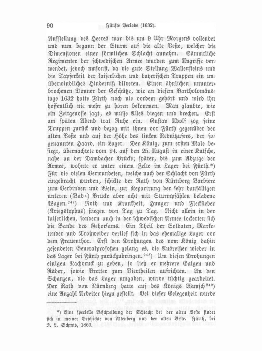 Ausstellung des Heeres war bis um 9 Uhr Morgens vollendet und nun begann der Sturm auf die alte Veste, welcher die Dimensionen einer förmlichen Schlacht annahm. Sämmtliche Regimenter der schwedischen Armee wurden zum Angriffe ver wendet, jedoch umsonst, da die gute Stellung Wallensteins und die Tapferkeit der kaiserlichen und bayerischen Truppen ein un überwindliches Hinderniß bildeten. Einen ähnlichen ununter brochenen Donner der Geschütze, wie an diesem Bartholomäus tage 1632 hatte Fürth noch nie vordem gehört und wird ihn hoffentlich nie mehr zu hören bekommen. Man glaubte, wie ein Zeitgenosse sagt, es müsse Alles biegen und brechen. Erst am späten Abend trat Ruhe ein. Gustav Adolf zog seine Truppen zurück und bezog mit ihnen vor Fürth gegenüber der alten Veste und auf der Höhe des linken Rednitzufers, der so genannten Haard, ein Lager. Der König, zum ersten Male be siegt, übernachtete vom 24. auf den 25. August in einer Kutsche, nahe an der Dambacher Brücke; später, bis zum Abzüge der Armee, wohnte er unter einem Zelte im Lager bei Fürth.