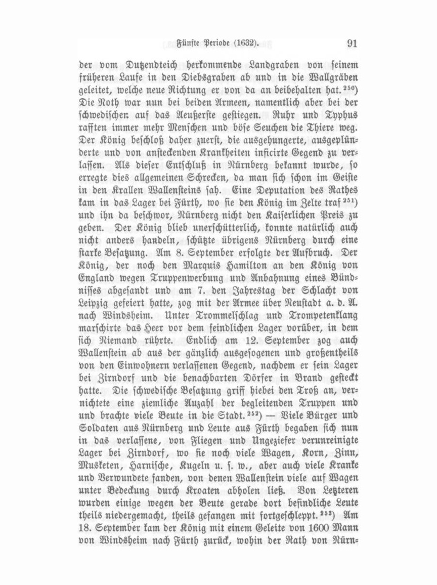 Für die vielen Verwundeten, welche nach der Schlacht von Fürth eingebracht wurden, schickte der Rath von Nürnberg Barbiere zum Verbinden und Wein, zur Reparirung der sehr baufälligen unteren (Bad-) Brücke aber acht mit Sturmpfählen beladene Wagen.-") Noth und Krankheit, Hunger und Fleckfieber (Kriegstyphus) stiegen von Tag zu Tag. Nicht allein in der kaiserlichen, sondern auch in der schwedischen Armee lockerten sich die Bande des Gehorsams. Ein Theil der Soldaten, Marke tender und Troßweiber verlief sich in das ehemalige Lager vor dem Frauenthor. Erst den Drohungen des vom König dahin gesendeten Generalprofoßen gelang es, die Ausreißer wieder in das Lager bei Fürth zurückzubringen. ?") Um diesen Drohungen einigen Nachdruck zu geben, so ließ er mehrere Galgen und Räder, sowie Bretter zum Viertheilen aufrichten. An den Schanzen, die das Lager umgaben, wurde tüchtig gearbeitet. Der Rath von Nürnberg hatte auf des Königs Wunsch "§) eine Anzahl Arbeiter hiezu gestellt. Bei dieser Gelegenheit wurde