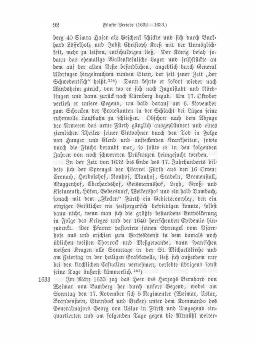 getragen: „Das auch sowohl von den Befehlshabern, so den Bürgermeistern zu Fürth unterschiedliche Clagen ankommen, daß die Bürgerschaft daselbst sehr unfleißig bei den Wachen sich be finden, der Flecken überall offen, auch der Amptmann wenig hinabkommt, dadurch dann der Feind leichtiglich den Flecken ausplündern, oder gar in Brand stecken kann. Solchen nach sein Herr Sigm. Holzschuhr Herrl. ersucht, die Verordnung bei dem Amptmann, auch der Gemeind zu vermeltem Fürth zu thun, damit sie die Wachen fleißiger ausstellen und besuchen, sodann auch die unlängst von Herrn Generalmajor von Schlemmersdorf und Capitän Schmidt angewiesen Palisaten und Schneller ehrst Ihnen selbst zum Besten und zur Versicherung fertig und machen. Unterzeichent: Generalmajor Schlemmersdorf, Ob. Laubelfing, I. I. Tetzel; S. Pfintzing.""?) Es sollte sich nur zu bald zeigen, wie recht die Nürnberger Kriegscommissare hatten und wie wenig ihre Anordnungen be folgt wurden. In der Nacht zwischen dem 18. und 19. Novem ber 1633 machte die forchheimische Besatzung einen Streifzug nach dem gegen fünf Stunden entfernten Fürth. Durch die Nachlässigkeit der Wache wurde Alles ausgeplündert, wurden 6000 Thaler an Werth erbeutet und der Pfarrer Johannes Ising sammt Weib und Kindern als Gefangene fortgeschleppt; auch dessen Priesterrock, Leibrock und Häublein, sowie alle Kleider seiner Kinder mitgenommen. Die Forchheimer machten dabei die Drohung, den ganzen Ort wegzubrennen, wenn er keine Contribution nach Forchheim zahlen werde."°) Im Januar 1634 klagte der bis dahin wieder freigekommene Pfarrer dem Rathe von Nürnberg seine traurige Lage und bat, sie allerseits wieder mit den nöthigen Kleidern zu versehen, damit er nicht